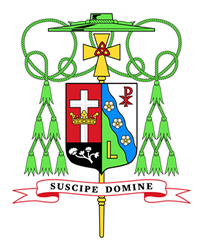 For his Personal Arms, seen in the dexter impalement right side of the design, Bishop Coerver adopted symbolic elements inspired in large part by his friend and architect, R. Andrew Bennett, all elements reflecting his life and heritage as well as his call to the fullness of the Holy Priesthood as Bishop of Lubbock. The Arms are composed of several significant elements. Prime among them, the blue wavy bar cutting across the right half of the blazon diagonally from left to right. Representing clearly a river, this evokes the Arms of the Diocese of Dallas where the Bishop spent most of his life and ministry. The river, which is white in the Arms of Dallas, symbolizes the Trinity River which flows through the heart of the city. Here the river is blue, calling to mind not only Our Lady but also his first Pastorate at Our Lady of the Lake Parish in Rockwall, Texas. Within the river rest three roses signifying not only the Most Blessed Trinity but also Saint Rita, patroness of the parish His Excellency served as Pastor until called to his new ministry in Lubbock. On the top right hand corner of the blazon, a red Chi-Rho. Greek letters which have since antiquity represented Christ, it’s a symbol used by the Bishop as a significant charge for his priestly ordination. To the lower left on a green field, a gold carpenter’s square, signifying woodworking, which belongs to the family’s heritage on his father’s side. The green field itself represents his Irish heritage, namely his mother’s side of the family. For his Motto, Bishop Coerver adopted the Latin phrase Suscipe Domine. Taken from the last meditation of the Spiritual Exercises of Saint Ignatius of Loyola and forming part of what is known as his Prayer of Self-Offering, it translates, “Take Lord, receive.” Completed with external ornaments of a gold processional Cross, standing behind the blazon, it bears the Trinitarian symbol of interlaced red knots, here symbolizing also Holy Trinity Seminary in Dallas, one of the Bishop’s almae matres, on whose faculty he served for eleven years; and a pontifical hat, a galero, with its six tassels, in three rows, on either side of the shield, all in green.